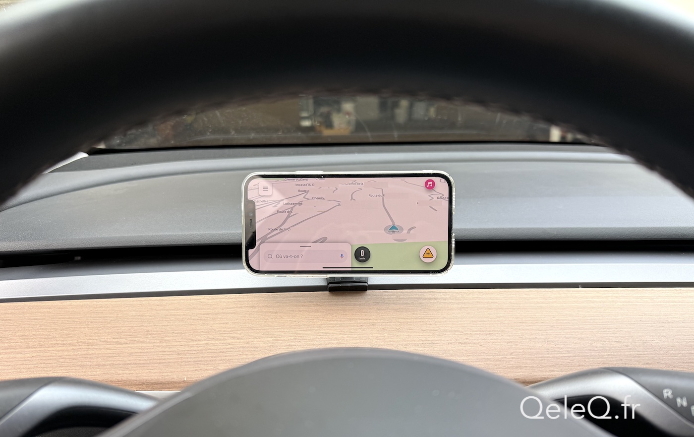 Enfin, on apprécie de pouvoir avoir le téléphone en face des yeux, réduisant d’autant la distance t donc le temps pris par l’oeil pour passer de la route à l’écran pour consulter les infos de limites de vitesse ou autres informations avec les applis type Waze, absentes de l’interface des Tesla. Ceci en position horizontale ou verticale, au choix avec la rotation immédiate en plus si on le souhaite